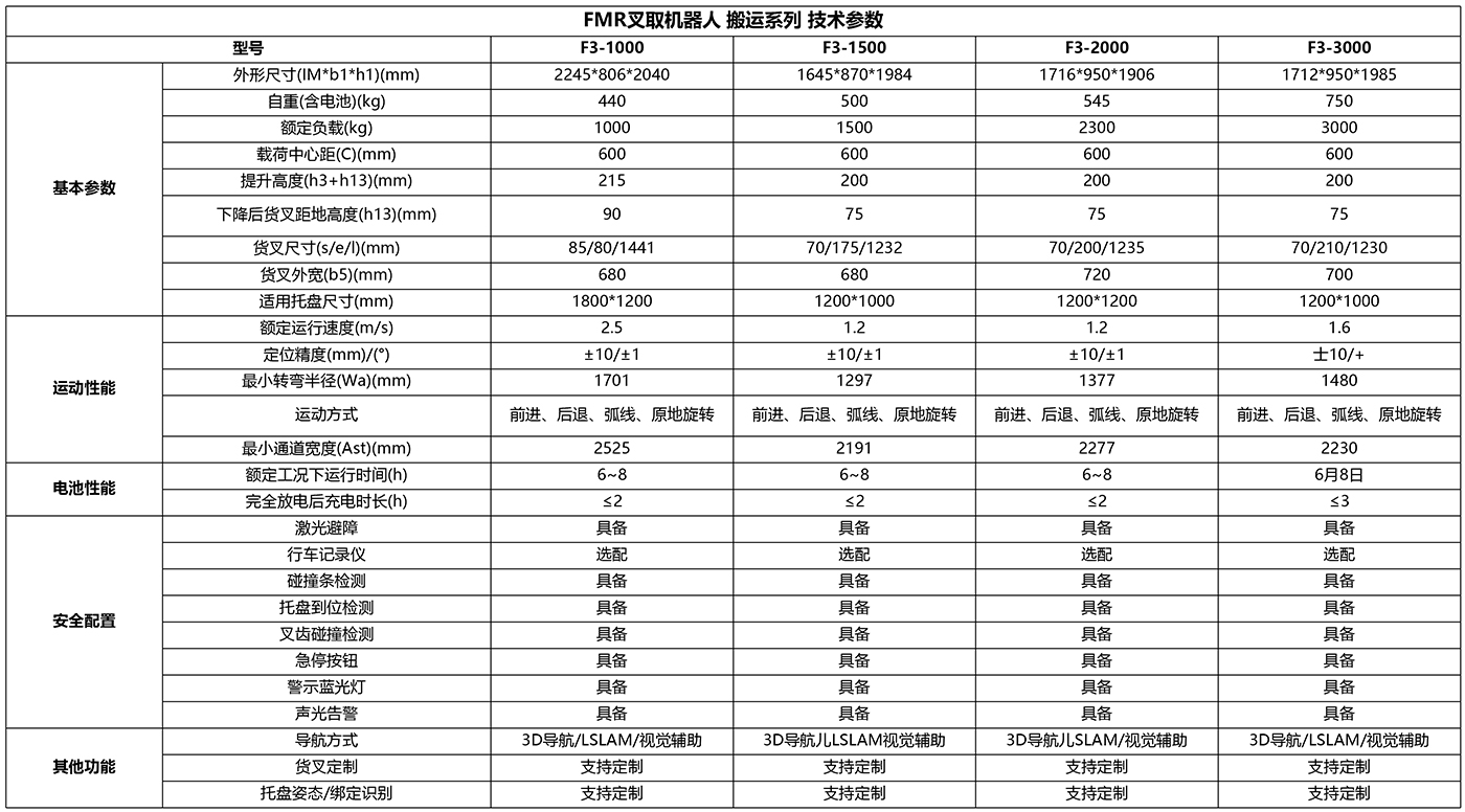 搬運(yùn)系列叉取機(jī)器人負(fù)載覆蓋1000kg到3000kg,最高行駛速度可達(dá)2m/s, 輕量化車體設(shè)計(jì),配備高容量電池,可依據(jù)需求選擇合適大小的電池,精準(zhǔn)需求減少冗余,專為機(jī)器人量身設(shè)計(jì)的車體厚度,大大減少了運(yùn)行的通道寬度,提升了物料存儲(chǔ)空間。全系列采用環(huán)境輪廓導(dǎo)航方式,持紋理導(dǎo)航, 充分利用環(huán)境信息進(jìn)行定位,方便部署和實(shí)施。