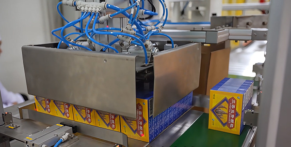 該工位將前端理料后的整齊產(chǎn)品一次性精準(zhǔn)抓取并放置在開好的紙箱內(nèi),配置有撐箱機(jī)構(gòu),保證產(chǎn)品順利進(jìn)入紙箱;同時(shí),該工位可配置合格證、說明書等包裝附件的自動(dòng)裝箱。