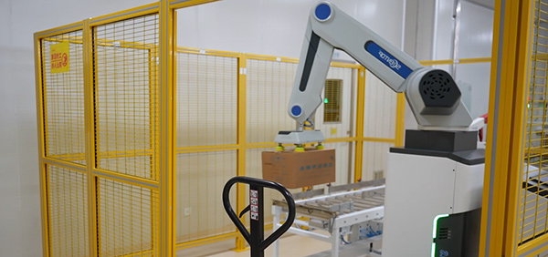 該工位將前端輸送來的已封好紙箱輸送至指定位置,自動碼垛機器人通過吸盤將紙箱按規(guī)定方式整齊碼放在托盤上;根據(jù)包裝方式、尺寸、負載等要求不同可定制抓取方式及承載能力。